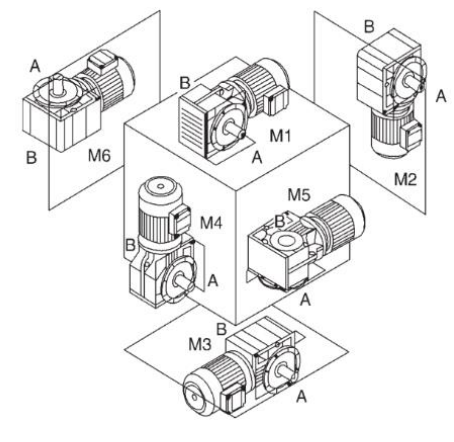M1 – двигатель расположен горизонтально, основание агрегата находится внизу. Двигатель М2 установлен вертикально вниз. M3 – двигатель расположен горизонтально, основание агрегата сверху. Двигатель М4 установлен вертикально вверх. M5 — горизонтально установленный двигатель, если он установлен в положение M1, с левой стороны блок поворачивается вниз (точка обзора: со стороны двигателя). M6 — горизонтально установленный двигатель, если он установлен в положение M1, с левой стороны блок поворачивается вверх (точка обзора: со стороны двигателя). | ![]() |