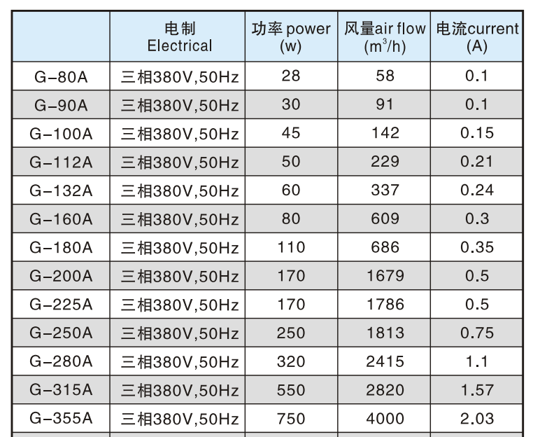 Таблица мощности, тока, расхода воздуха осевого вентилятора
