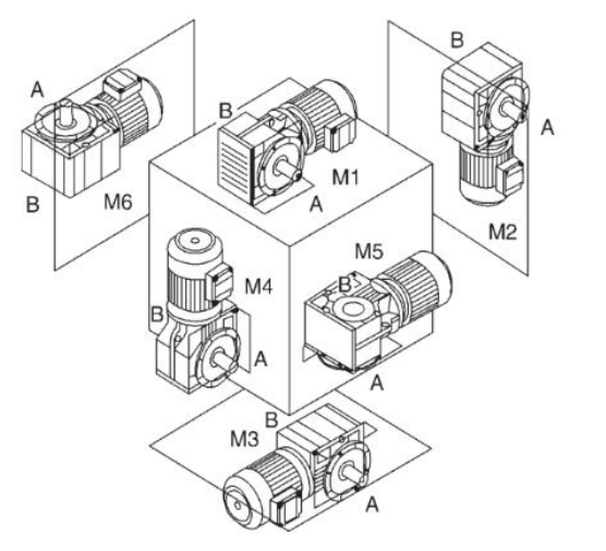 M1 – двигатель расположен горизонтально, основание агрегата находится внизу. Двигатель М2 установлен вертикально вниз. M3 – двигатель расположен горизонтально, основание агрегата сверху. Двигатель М4 установлен вертикально вверх. M5 — горизонтально установленный двигатель, если он установлен в положение M1, левая сторона блока поворачивается вниз (точка обзора: со стороны двигателя). M6 — горизонтально установленный двигатель, если он установлен в положение M1, левая сторона устройства поворачивается вверх (точка обзора: со стороны двигателя). | ![]() |